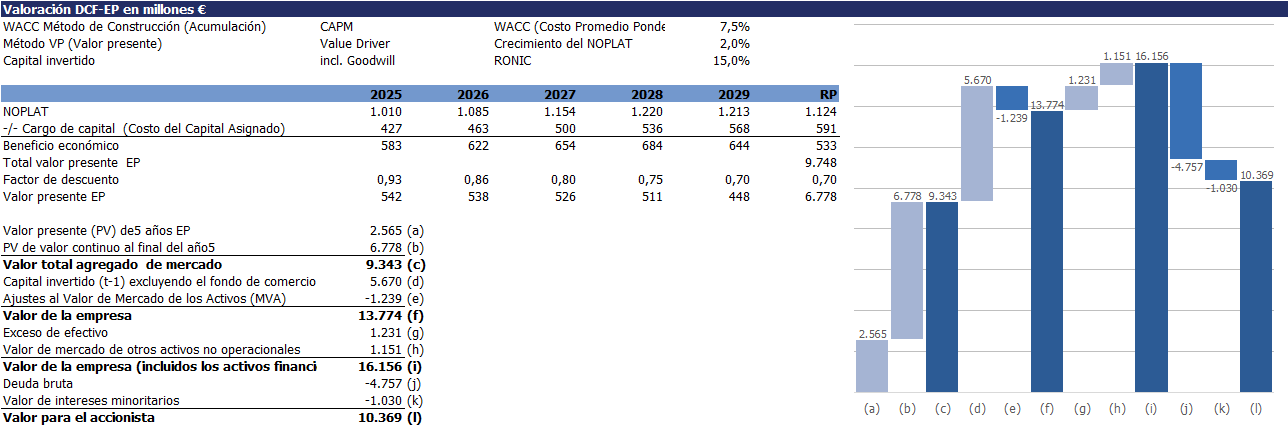 El método DCF-EP es una variante del DCF-WACC, en la que la creación de valor futura (Beneficio Económico, Economic Profit, EP) se hace transparente por periodo.