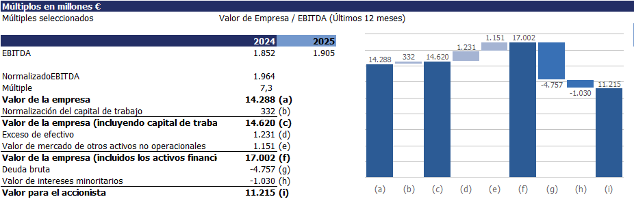 Deduciendo la deuda de ese valor de empresa y añadiendo el exceso de activos líquidos (y otros activos financieros), se determina el valor para el accionista. El resultado de multiplicar el múltiplo por la métrica financiera utilizada no arroja directamente el valor de las acciones; es necesario realizar un cálculo adicional para determinar el valor de los fondos propios.