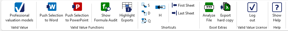 Todas estas funcionalidades garantizan que los informes y análisis sean altamente eficaces. Además, estas funciones pueden utilizarse con cualquier archivo Excel, no solo con el modelo Valid Value. Por supuesto, nuestro complemento está optimizado para el Modelo Valid Value.